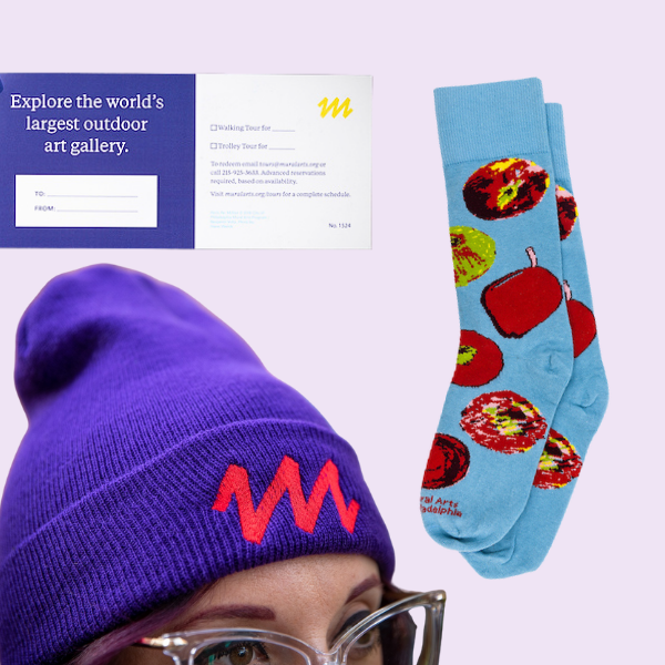 This cozy bundle features a new beautifully branded Mural Arts knit beanie plus a pair of custom-designed cotton knit crew socks (Made in the USA) with original artwork by Mat Tomezsko and participants of the Color Me Back program in Kensington, and a Mural Walking Tour gift certificate for 2 people.
