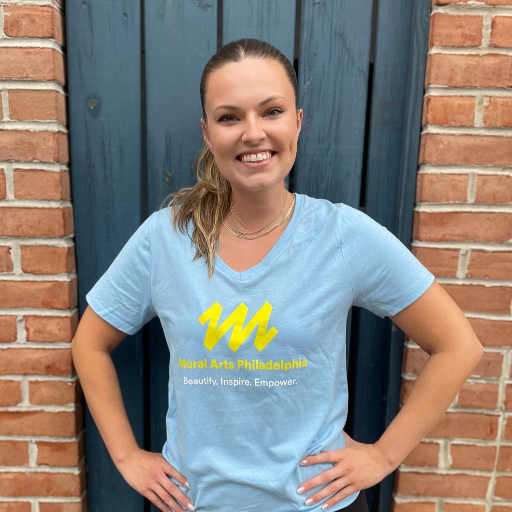 Wear Mural Arts Philadelphia's new slogan proud with this new, bright, light blue T-shirt. A perfect complement to any warm weather ensemble!